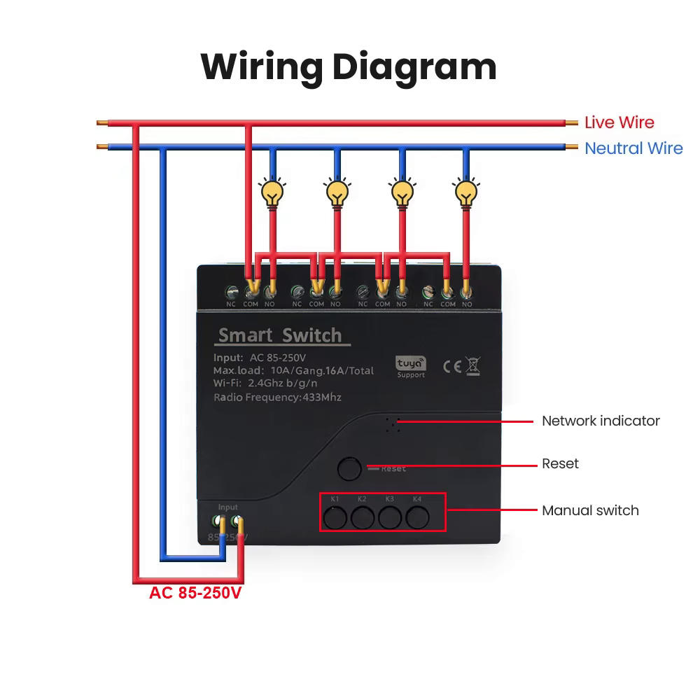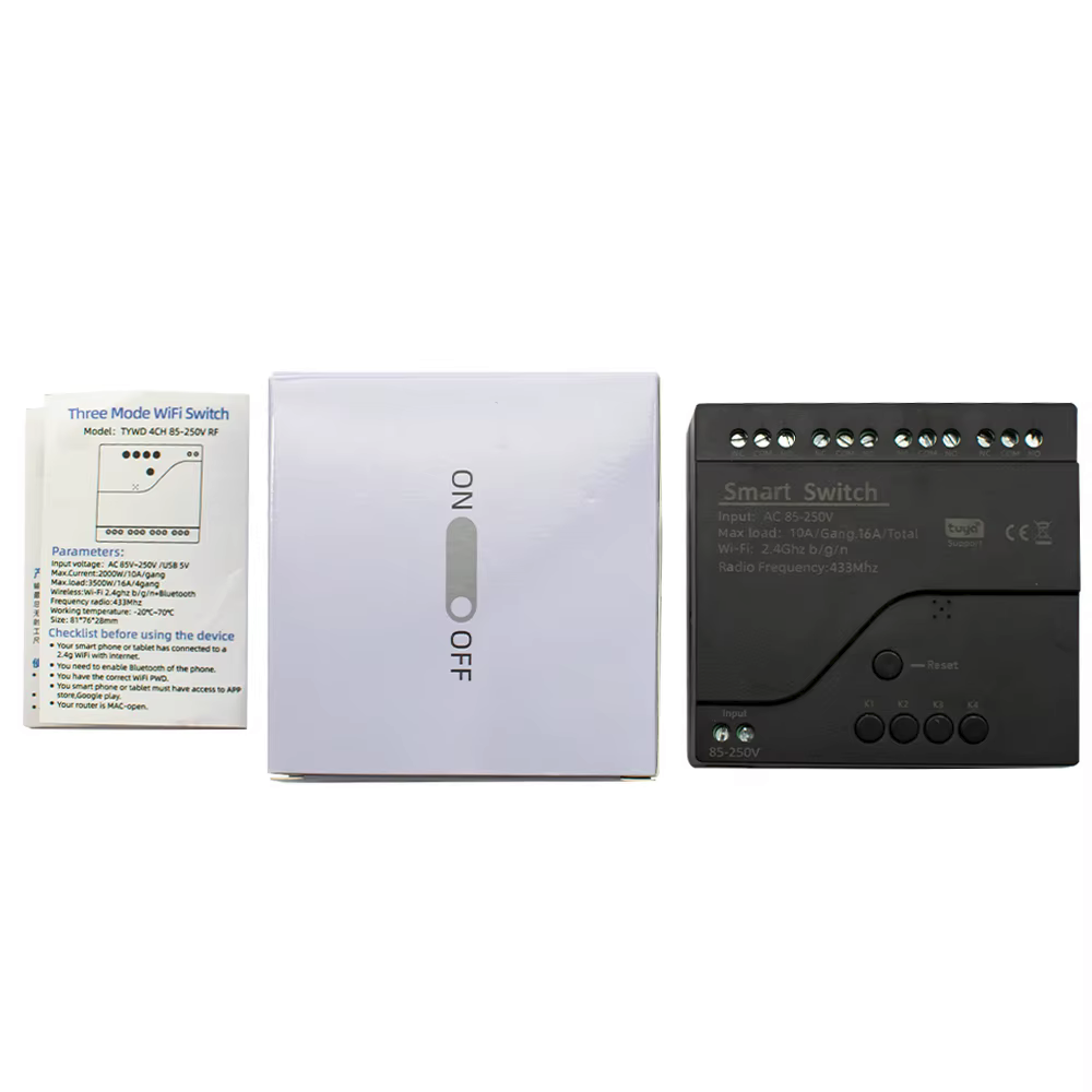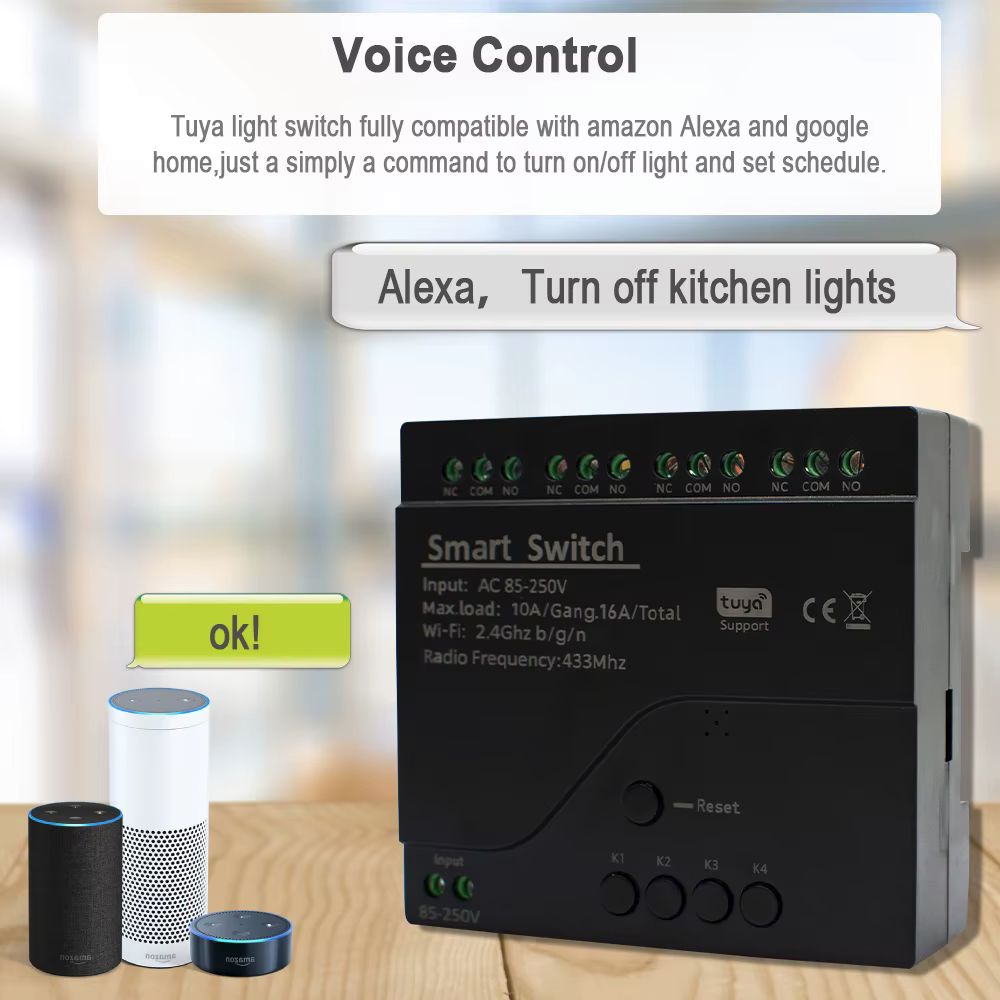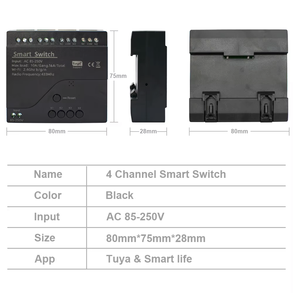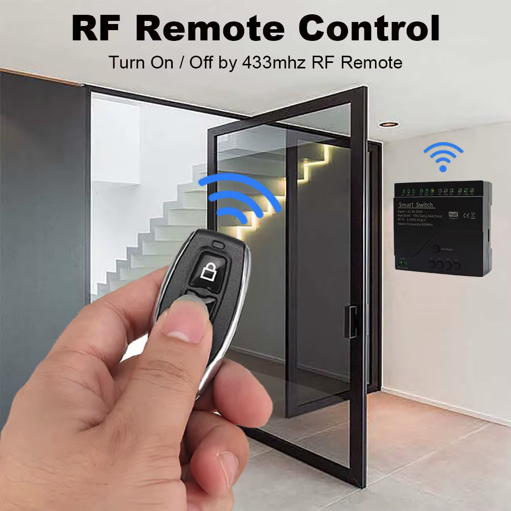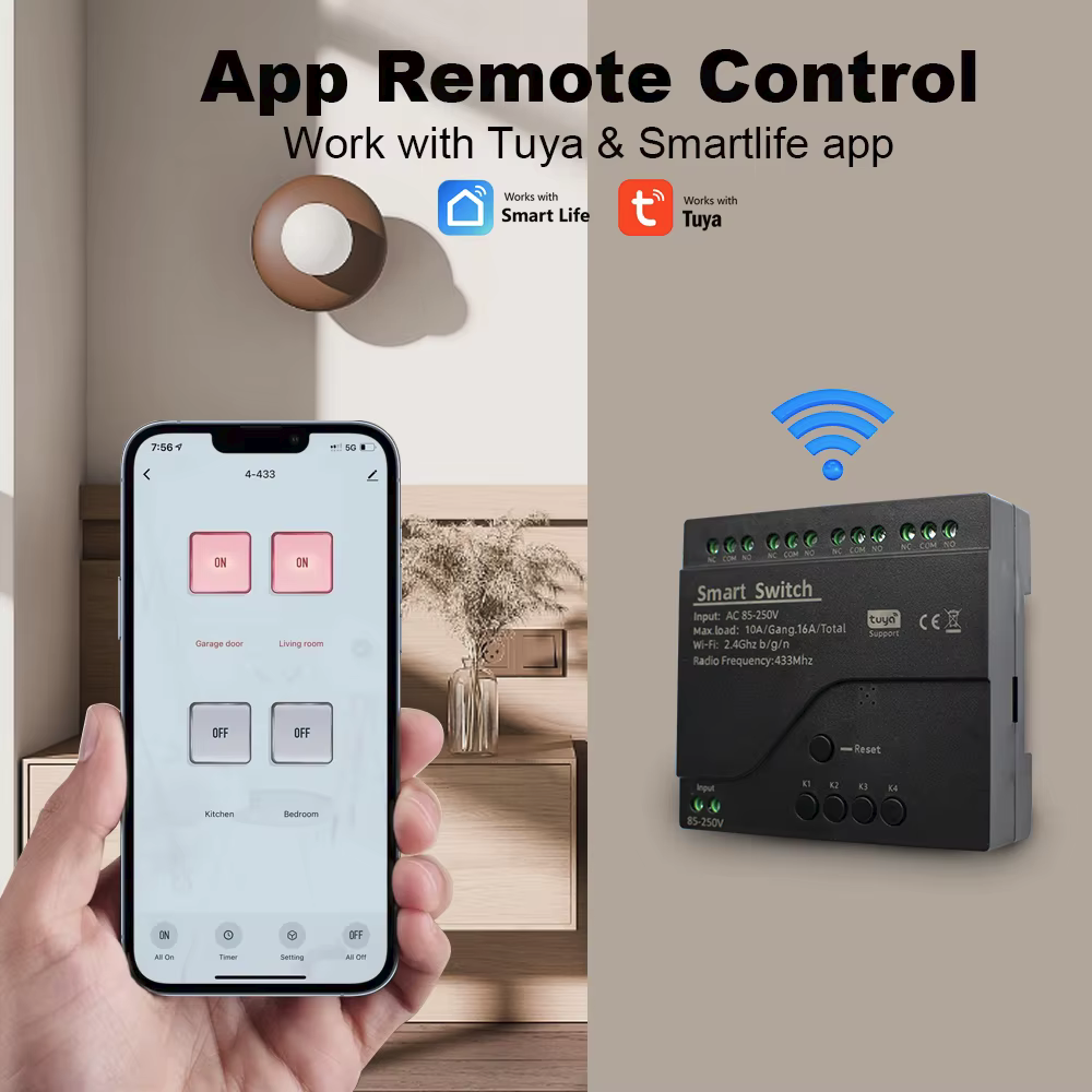 * App Support: Free iOS and Android Smart Life/Tuya Smart mobile app. * Sync Status: Real-time device status provided to the app. * Remote On/Off: Turn 4 electrical appliances on/off remotely from anywhere. * RF Remote Control: Turn on/off with a 433MHz RF remote control inside, only supports 433MHz learning code. * Working Modes: 4CH switch between interlocking/self-locking/inching modes. * Independent Control: Control each gang separately in the Tuya app. * Supports remotely turning on or off connected devices, such as lights, electric kettles, electric rice cookers, electric curtains, etc. * Timing: Supports 8 countdown/single/repeat tasks to turn on/off at a specified time. *DIN rail mounting: ideal for industrial control. *Voice control: fully compatible with Alexa, Google Home, and Google Nest. *Share control: control your smart home with your family.