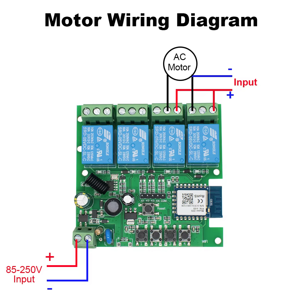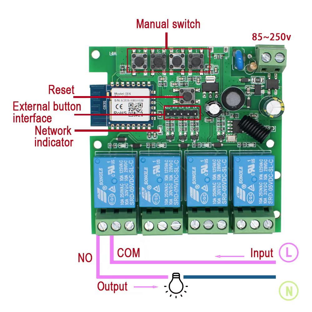 This product is a wireless switch that supports momentary toggle and interlock (inching/self-locking) modes. Users can add the device to the Smart Life app to remotely control connected household appliances or devices. In self-locking mode, customers can instantly turn connected devices on and off remotely. In inching mode, customers can select two wiring methods, and you can set the inching time in the app. WiFi control model, no programming required. No matter where you are, simply download an app to connect to Wi-Fi and control the cloud. RF mode, you can control the board with an RF433 learning code remote control.